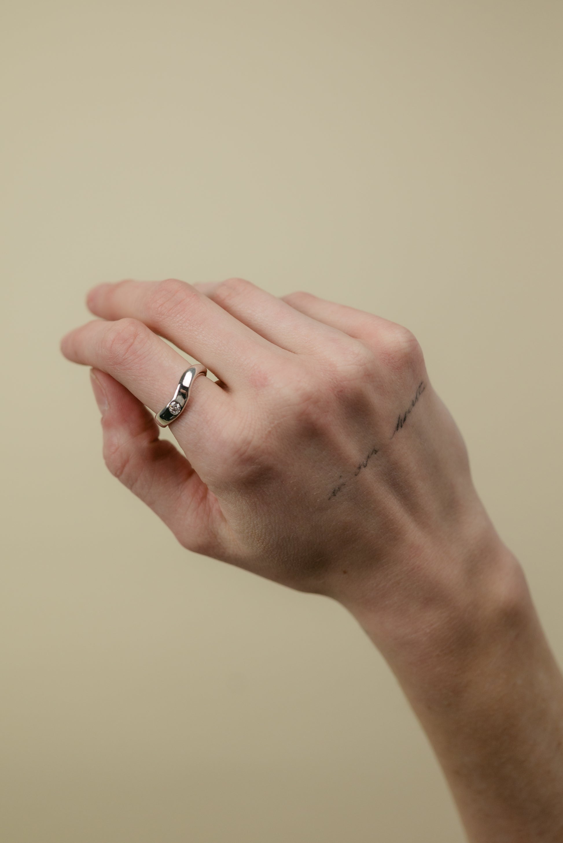 Our Stacking Band is a fluid take on the classic stacking band. Handcrafted in solid sterling silver (.925), its gently curved form is accented by a 0.3ct Moissanite. Each piece is made to order and entirely one of a kind, with subtle variations in its wave-like shape. Designed for everyday wear, it's sweet but subtle.