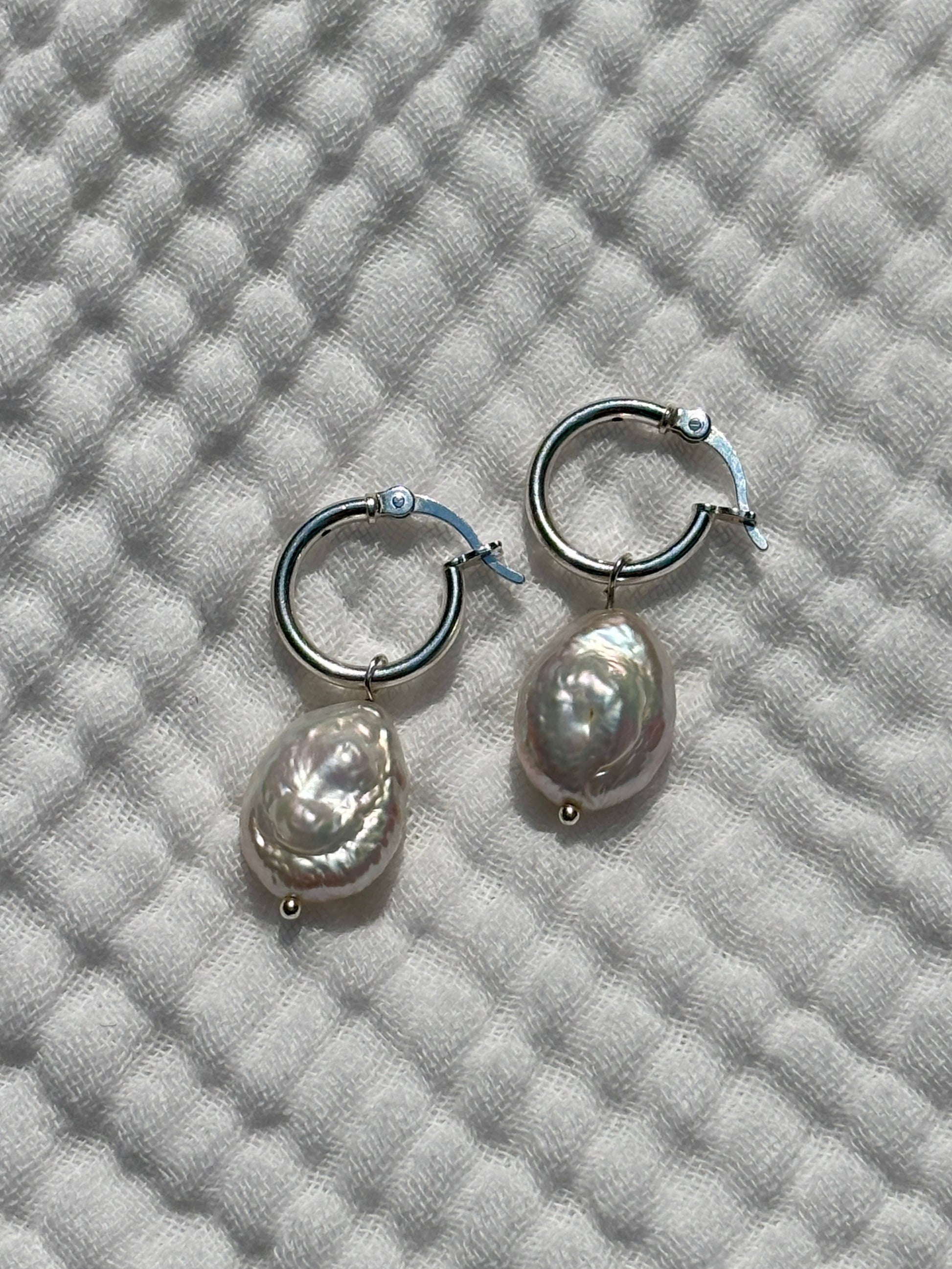 White Freshwater Pearl featured on Sterling Silver Hoops.